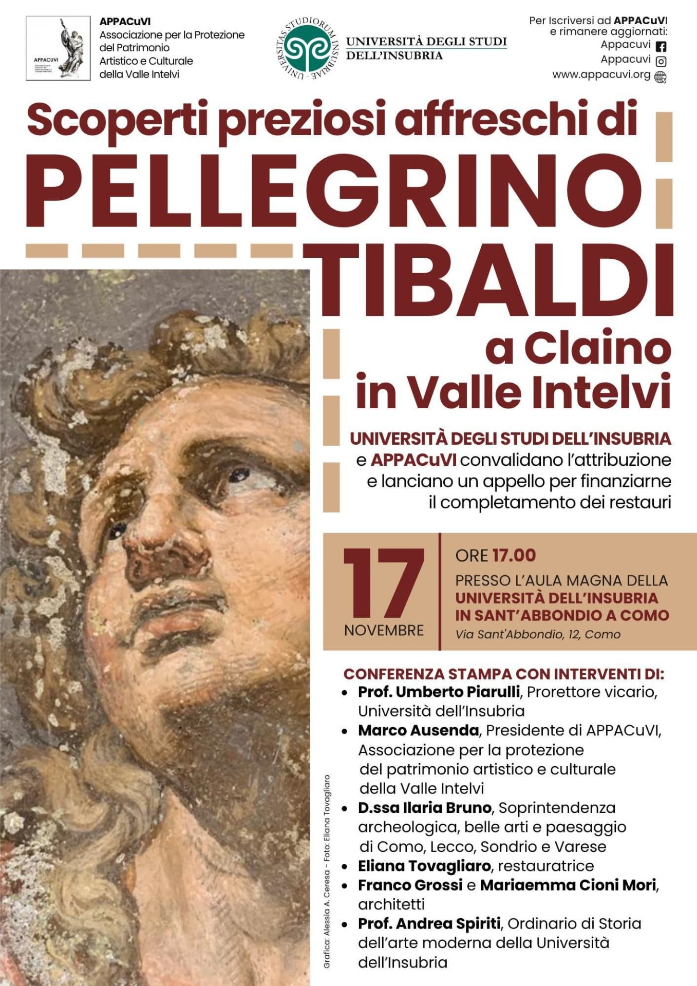 L'Università degli Studi dell'Insubria e APPACuVI annunciano la scoperta e l'attribuzione di preziosi affreschi a Pellegrino Tibaldi, epigono di Michelangelo, a Claino in Valle Intelvi.